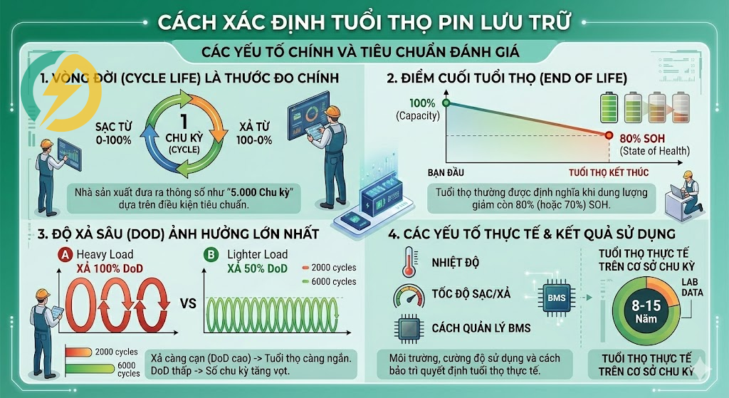 Để đánh giá chính xác tuổi thọ của pin lưu trữ năng lượng (Energy Storage System – ESS), chúng ta cần hiểu rõ các khái niệm kỹ thuật thay vì dựa vào cảm tính. Tuổi thọ của pin không chỉ tính bằng năm mà quan trọng hơn là tính bằng chu kỳ sạc xả (Cycle Life).
